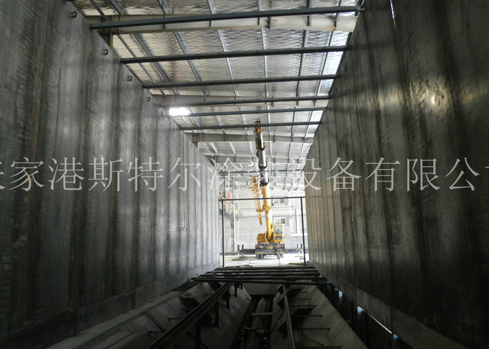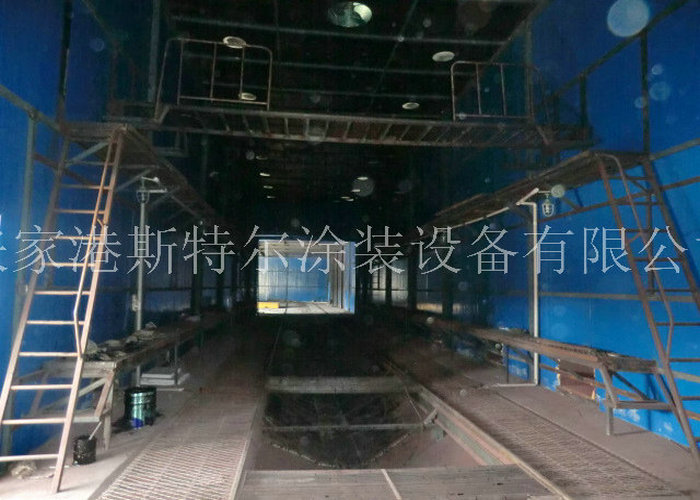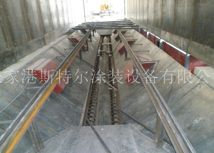 兩側裝有活動陽臺,高度400mm,材料為3mm花紋板,角鐵與圓鋼做支架,兩側頂部裝有2000mm高度固定式噴砂陽臺,;下部為4米深度地坑,分為2層,上層2米為底部噴砂用,下層為絞龍回砂系統安裝層。